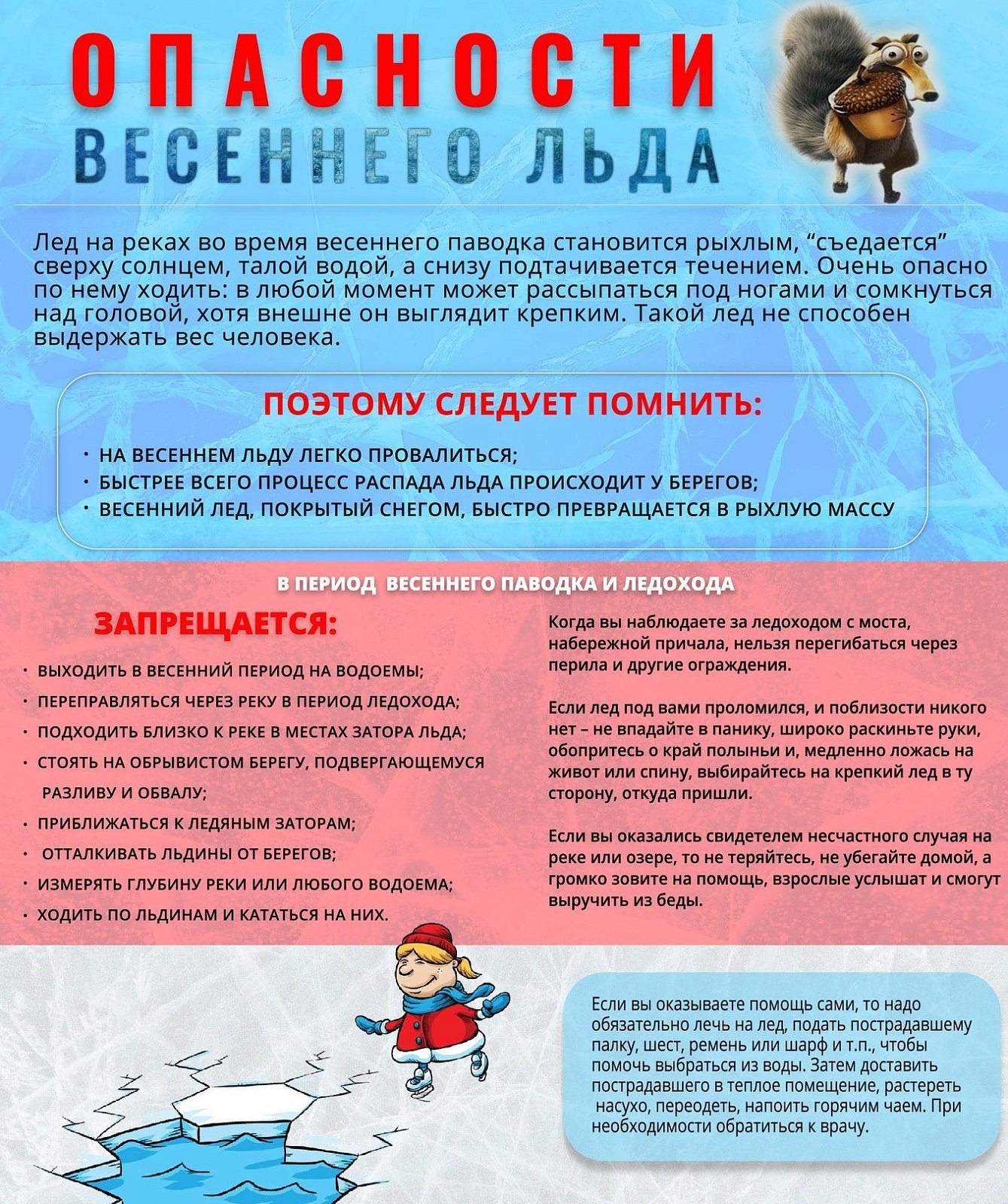Весной на водоемах образуется тонкий лед. Ежегодно тонкий лед становится причиной гибели людей, как правило, среди пострадавших оказываются дети. Избежать происшествий можно, если запретить детям посещать водоемы. Уделите внимание своим детям, расскажите об опасности выхода на непрочный лед. Интересуйтесь, где ваш ребенок проводит свободное время. Не допускайте переход и нахождение детей на водоемах в весенний период. Особенно недопустимы игры на льду! Легкомысленное поведение детей, незнание и пренебрежение элементарными правилами безопасного поведения - первопричина грустных и трагических последствий. Помните: чужих детей не бывает!